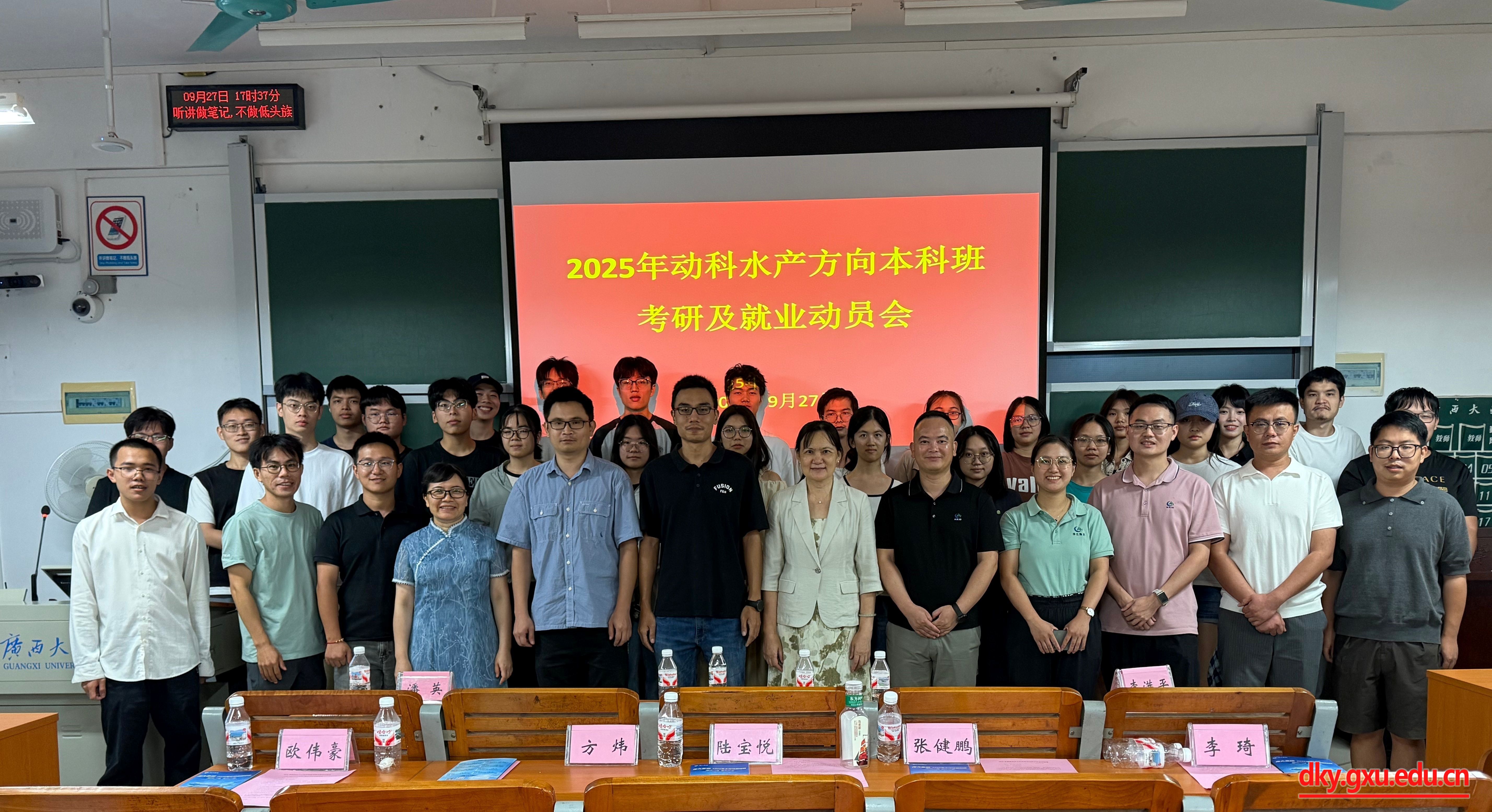 9月27日,广西大学动物科学专业水产养殖方向考研及就业动员会在东六教6A-228顺利召开。海大集团北部湾片区人力总监李满平,湛江海大人事经理曹春玲,技术服务高级工程师于杰,湛江容大人事主管钟一民,加拿大pc28预测结果走势分析水产学科带头人潘英,动物科学系副主任黄洁萍、水产学科专任教师以及本科生和研究生参加了此次会议。会议由水产方向第一个本科班“动科224班”班主任欧伟豪老师主持。