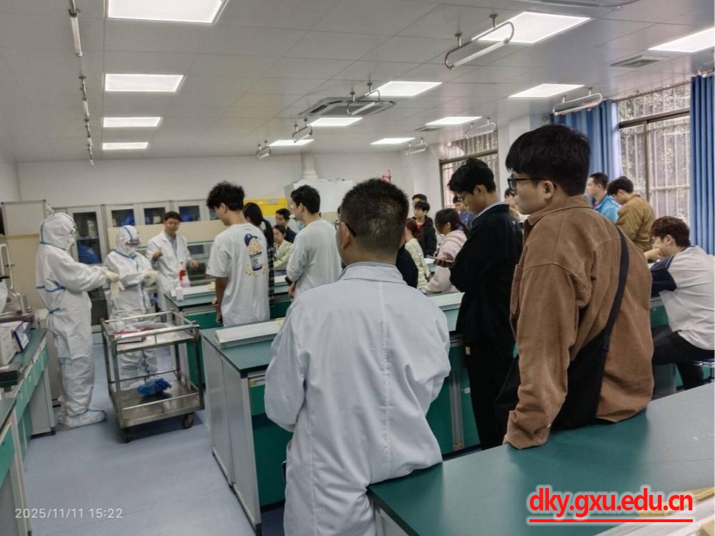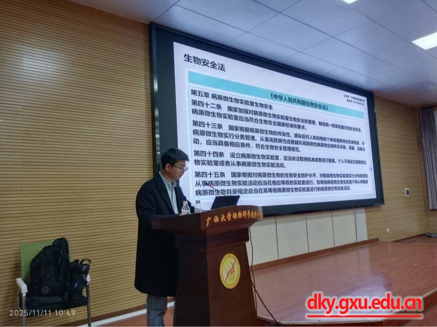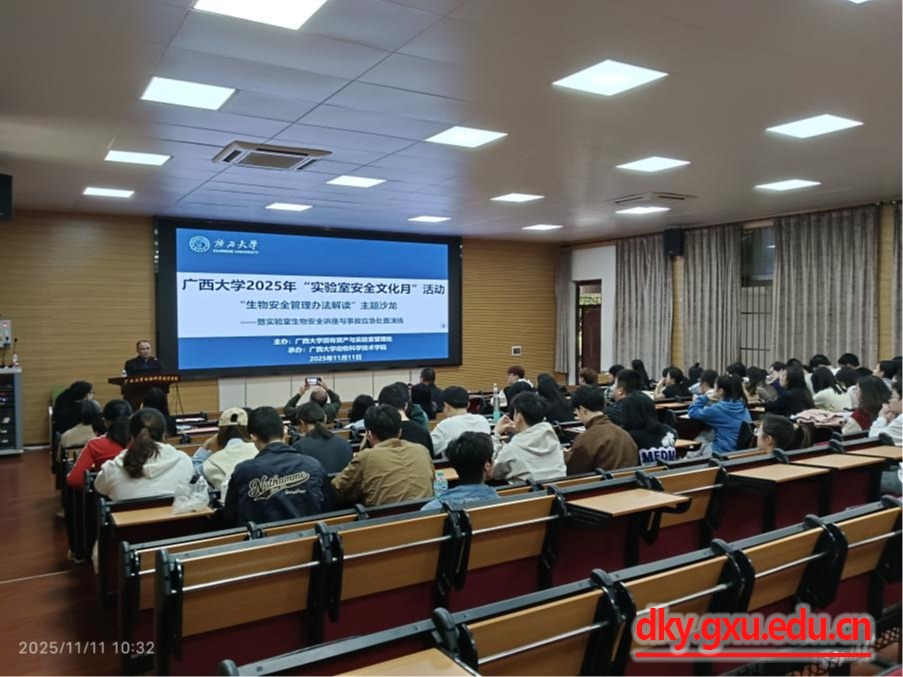 为深入推进校园安全文化建设,切实提升师生生物安全意识与应急处置能力,11月11日,广西大学加拿大pc28预测结果走势分析以“安全文化月活动”为契机,特邀生物安全领域资深培训师屈文军老师,为师生开展生物安全专题培训和二级生物安全实验室感染性物质溢洒事件应急演练。全校相关学科教师、学生共计200余人参与培训和演练。